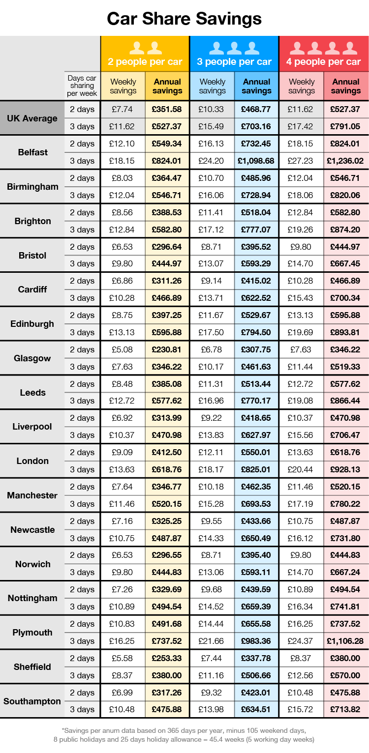 The main reason most people organise a car share is to save money. We conducted a survey to find out the costs associated with driving to work each day around the UK, and calculated the potential savings from sharing a ride.
