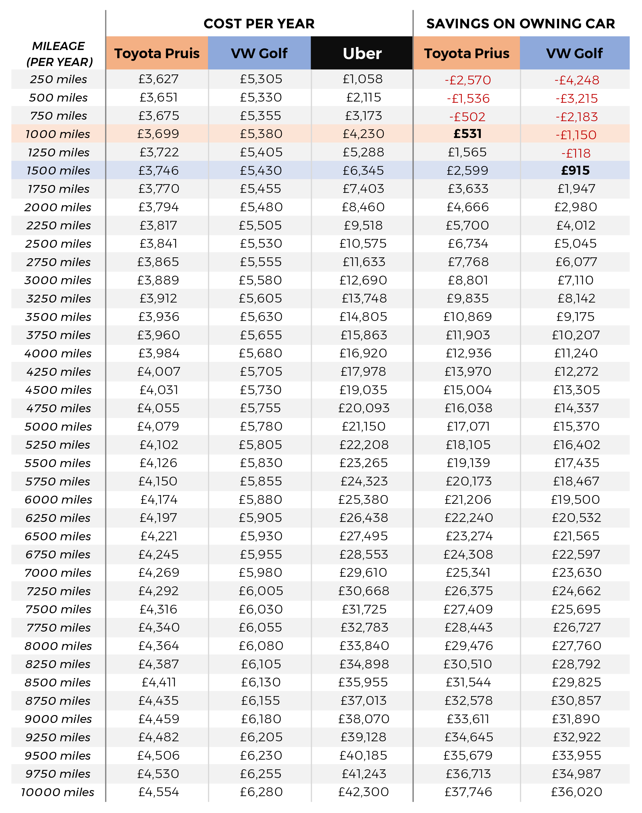 Once you hit the 1000-mile mark, your annual bill as a car owner would be cheaper than the total of your Uber fares. Bear in mind that you’d only need to travel 2.74 miles per day to clock up a thousand each year. You’d have saved £531 by owning and driving your own Toyota Prius, compared to travelling in the back of one via Uber.