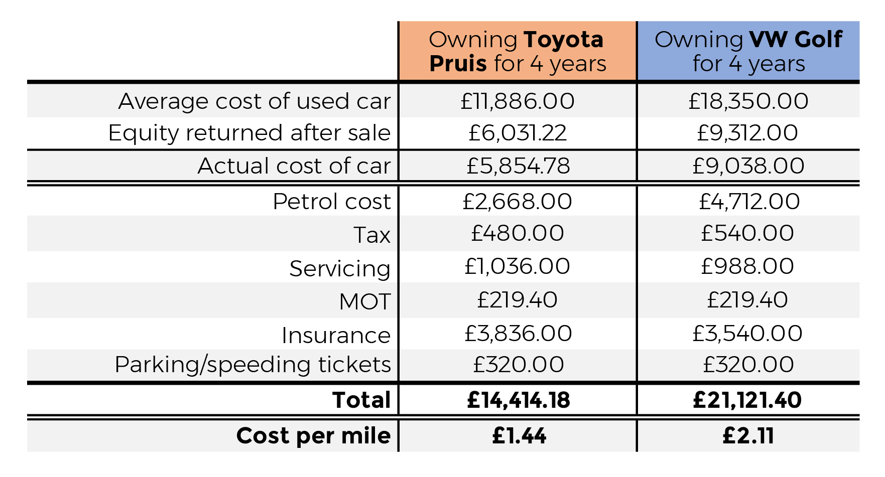 We crunched the numbers to calculate the average cost per mile for two affordable car models. Focusing on both a used Toyota Prius and a used VW Golf, we added up all the charges involved in owning and running these vehicles over a 4-year period. Using a range of sources, we recorded the purchase cost of the car, then subtracted the equity you could expect to receive back when you sell after the four years, to find the model’s ‘actual cost’. Next, we factored in petrol, tax, servicing, MOT and insurance costs, as well as fines one might receive for parking or speeding tickets.