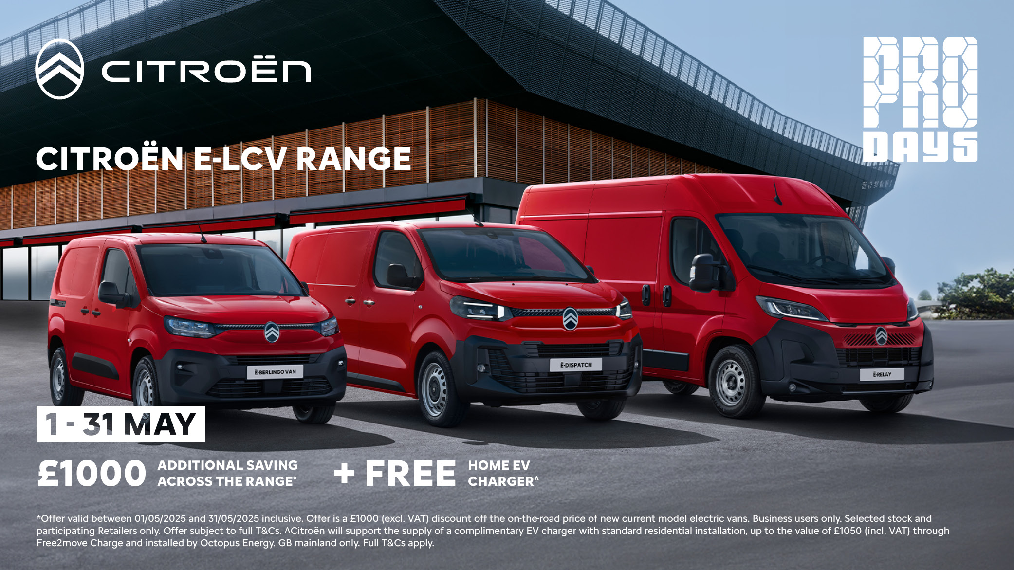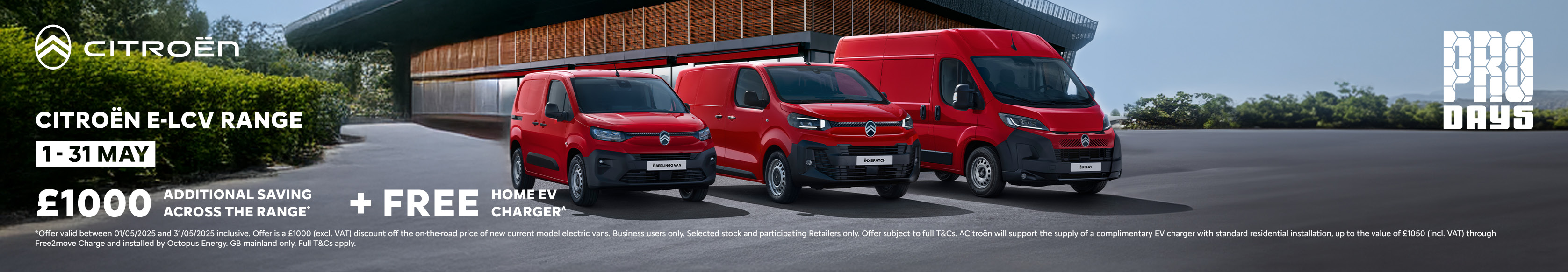 *Offer valid between 01/05/25 and 31/05/25 inclusive, with vehicles required to be registered by 30/09/25. Offer is a £1,000 (excl. VAT) discount off the on-the-road price of new current electric vans. Business users only. Selected stock only. Applicable models Citroen E-Berlingo, E-Relay & E-Dispatch, available on stock vehicles and new factory orders.