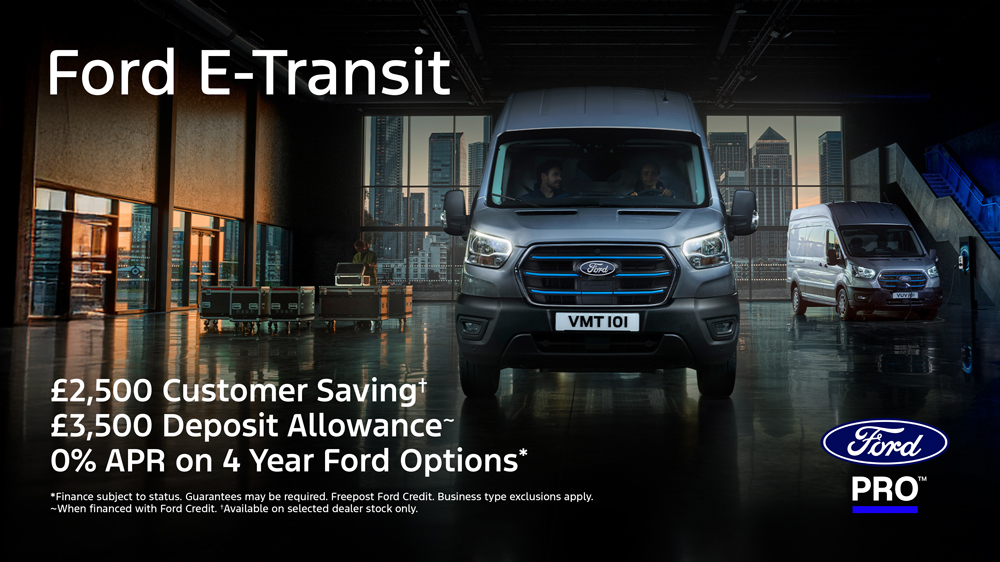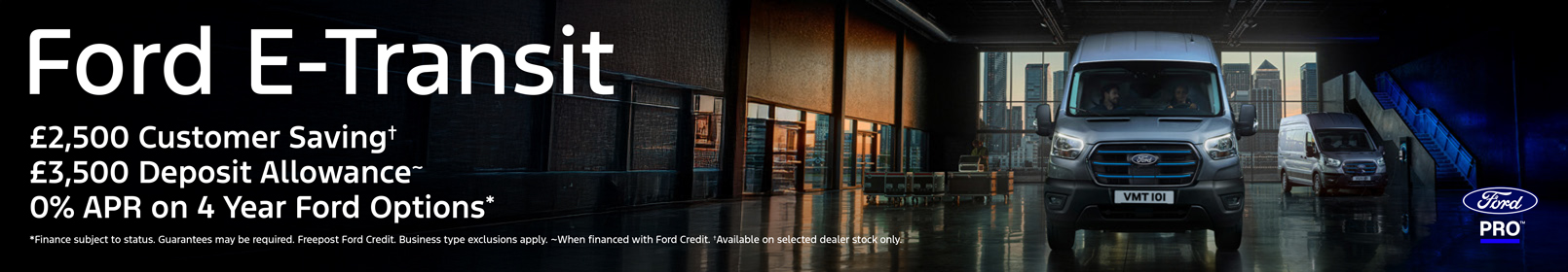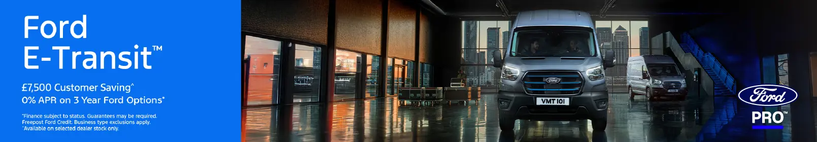 Until 31st December 2025, the E-Transit is available with 0% APR on 3 Year Ford Options* and a £7,500 Customer Saving^.