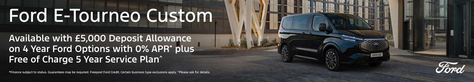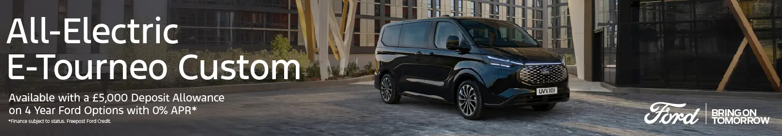 Until 30th June 2025 the Ford E-Tourneo Custom is available with a £5,000 Deposit Allowance on 4 Year Ford Options with 0% APR*.