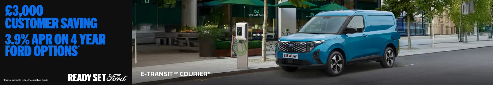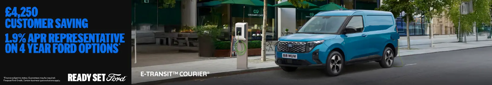 What’s more, until 31st March 2026, the E-Transit Courier is available with low-rate finance – 1.9% APR representative* on 4 year Ford Options and a £4,250 Customer Saving.