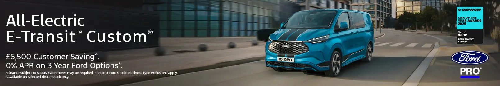 Until 31st December 2025, the All-Electric E-Transit Custom is available with 0% APR~ on 3 Year Ford Options and a £6,500 Customer Saving^.