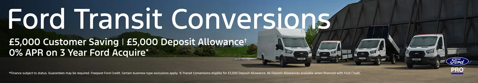 Until 30th September 2025, Transit Van Conversions are available with 0% APR on 3 year Ford Acquire with Balloon*. **Includes a customer saving of £5,000 and a dealer saving of £5,000.