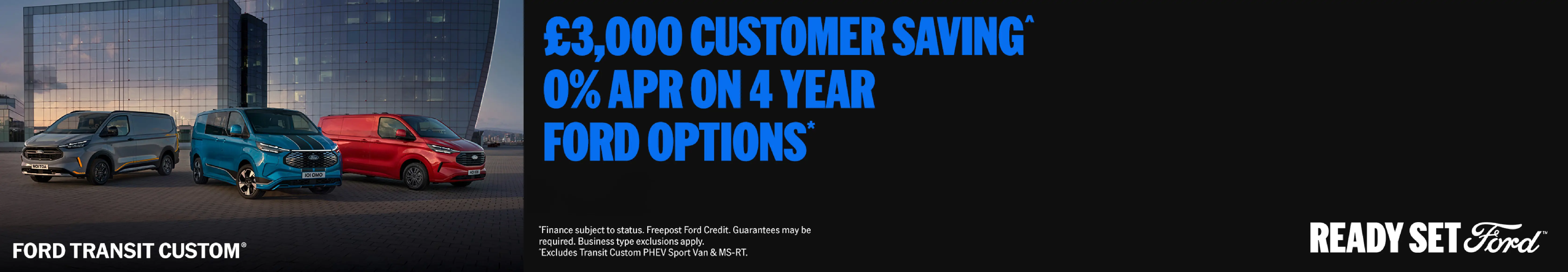 Until 30th June 2026, All-Electric E- the Transit Custom range is available with 0% APR on 4 Year Ford Options~.