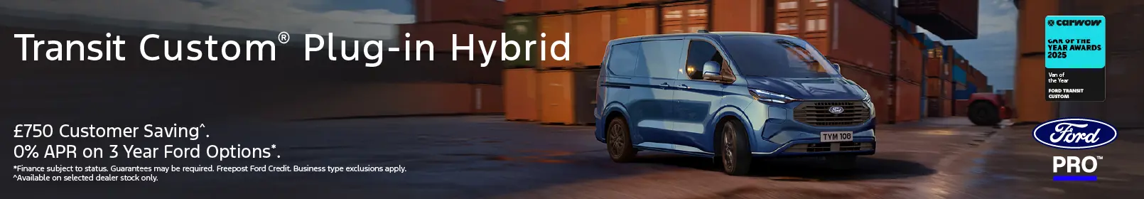 Until 31st December 2025, Transit Custom PHEV is available with 0% APR on 3 year Ford Options~ with a £750 Customer Saving^.