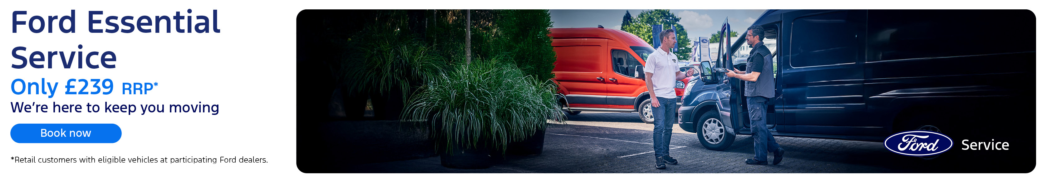 [†]Ford Essential service and repairs are available at participating Ford Dealers for older passenger cars and commercial vehicles outside their warranty with up to and including 2.5L engines and are applicable to retail customers only. All published prices are recommended retail prices and include parts, labour and VAT. Mustang, RS models and LPG derivatives are excluded.