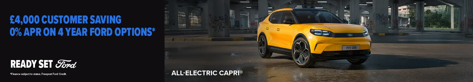 Until 31st March 2026, the All-Electric Capri is available with 0% APR* on 4 Year Ford Options and a £4,000 Customer Saving.