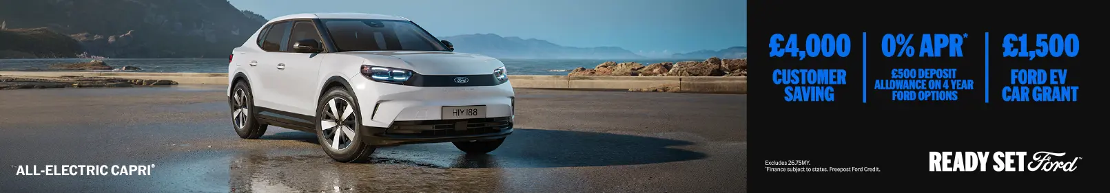Until 30th April 2026, the All-Electric Capri is available with a £500 Deposit Allowance on 0% APR* on 4 Year Ford Options and a £4,000 Customer Saving†.