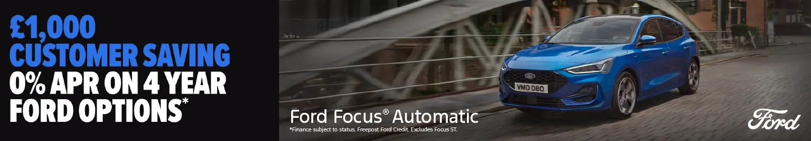 Until 31st December 2025, Focus is available with 0% APR* on 4 Year Ford Options and £1,000 Customer Saving^.