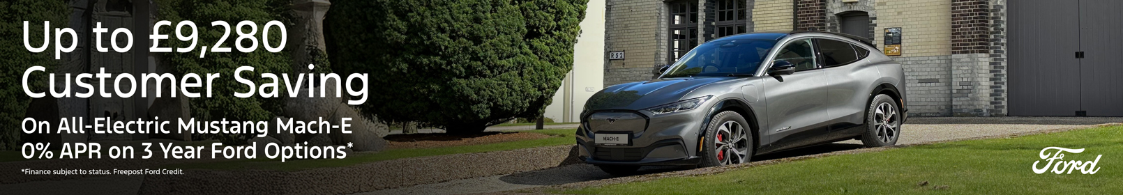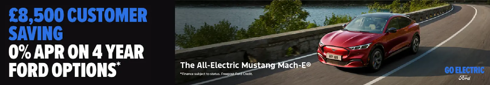 Until 31st December 2025, the Mustang Mach-E Range is available with 4 Year Ford Options at 0% APR* and an £8,500 Customer Saving.