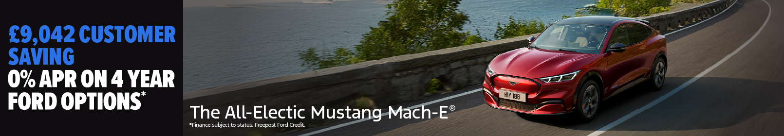 Until 31st December 2025, the Ford Mustang Mach-E is available with 0% APR on 4 Year Ford Options*.