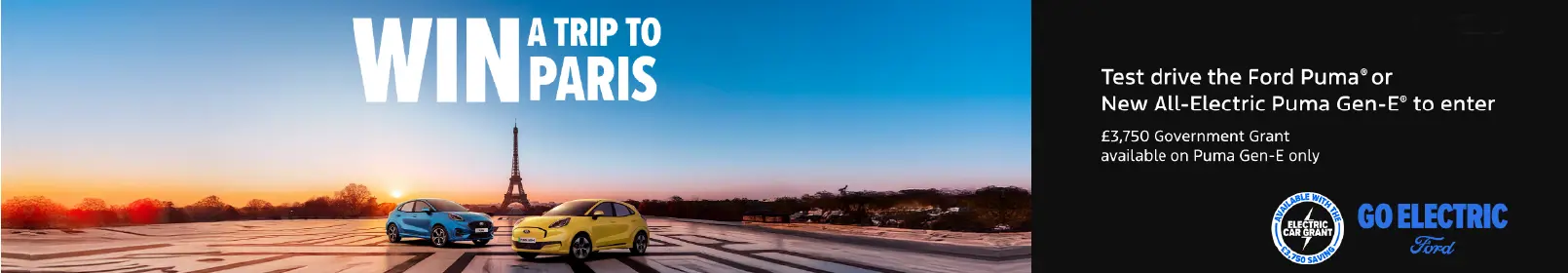 Test drive the New All-Electric Ford Puma ® or Ford Puma® EcoBoost Hybrid and you could win a luxury 3-night break in the City of Lights with 3 of your closest friends.