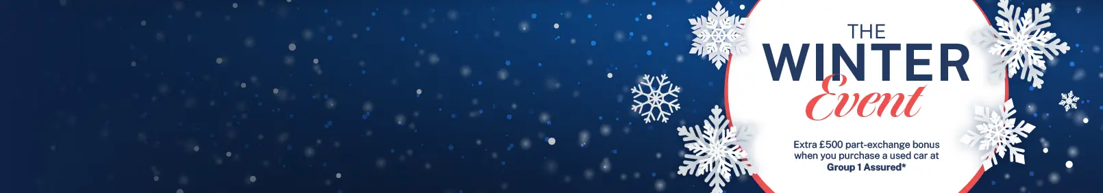 Discover unmissable offers at the Group 1 Assured Winter Event from Saturday 27 December - Sunday 11 January. During the event, we'll give you an extra £500 towards your part-exchange* when you purchase a used vehicle from us.