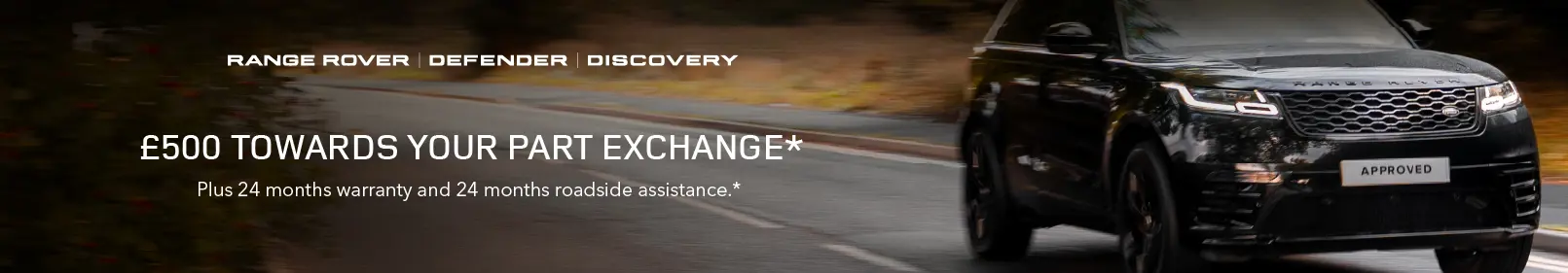 ^Deposit contribution of £500 with up to 11.9% APR Representative on Personal Contact Purchase or Hire Purchase offer. Available to all clients purchasing Approved Used vehicles aged from 0-12 months, when financed through Land Rover Financial Services from 1st-31st October 2025. Minimum balance £15,000.