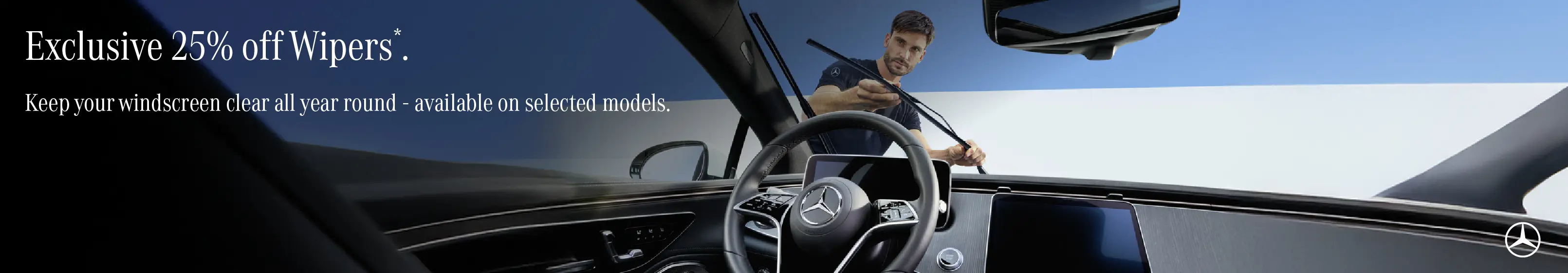 *Subject to availability. Offer may be extended, varied or withdrawn at anytime without prior notice. Available on selected models, 25% discount taken off the RRP of a set of two front wipers: A-Class (RRP £54.96) - now £41.23, C-Class (RRP £56.60) - now £42.46, E-Class (RRP £67.80) - now £50.86, GLC (RRP £66.96) - now £50.23 and GLE (RRP £71.88) - now £53.92.