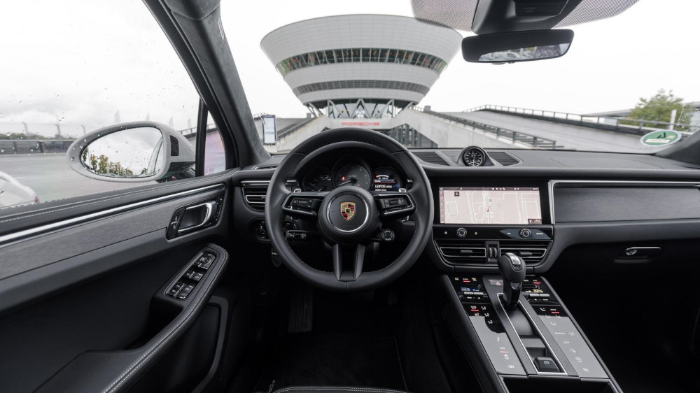 Inside the Macan features sports front seats which ensure a good view of the road whilst remaining closely connected to it and a cockpit like feel is created from the three-dimensional arrangement of the controls. The sports steering wheel harks to the 918 and the typical Porsche three-tube instrument cluster remains with a centrally positioned rev counter. In the centre of the car is a 10.9" touchscreen controlling all of the car's vital functions, media and navigation as well offering smartphone integration.