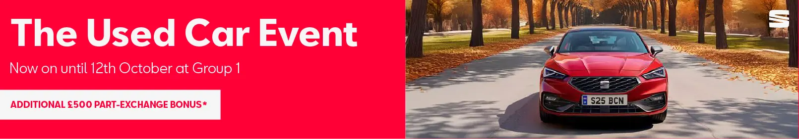 From now until 12th October, take advantage of our Exclusive Group 1 Used Car Event and receive an additional £500 part-exchange bonus* when you choose from our wide selection of quality Approved Used SEAT cars.