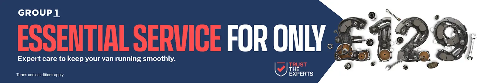 * Essential Service for £129 is valid until 31/12/2025 for vehicles (for the Manufacturer Commercial Vehicle brands Group 1 represent) aged over 7 years and with a vehicle engine size up to 2.5L. (Excludes performance models) and must be booked in advance. Offer price applies to retail customers at participating Group 1 dealerships, is subject to availability and cannot be used in conjunction with any other promotion. Offer may be withdrawn at any time. In certain peak periods, limited availability may apply. Our essential service is not a manufacturer approved service and does not replace your manufacturer recommended servicing schedule.