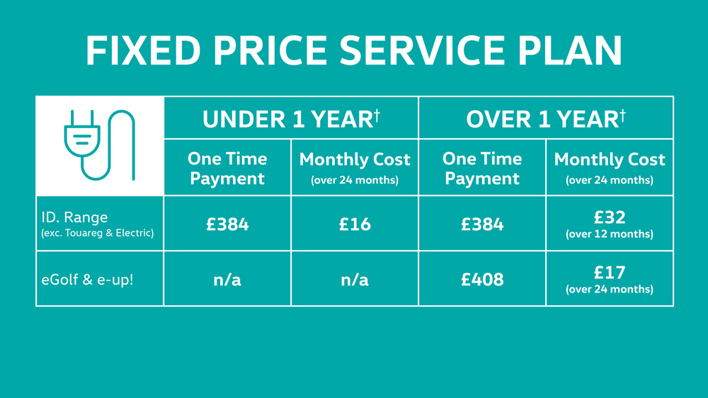 †Excludes Volkswagen Commercial Vehicles. Pay monthly option for vehicles under 200,000 miles. Servicing must be carried out at a Volkswagen UK Authorised Repairer, in line with the requirements of the service schedule. Additional work, including wear and tear, is excluded. Service Plan validity is dependent on required payments received. Volkswagen Financial Services.