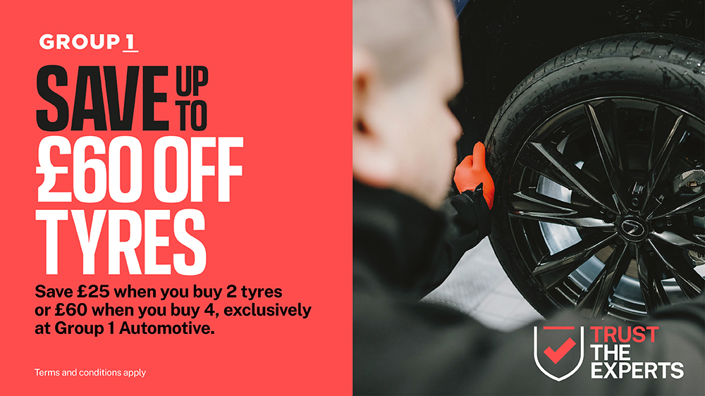 *Offer may be extended, varied or withdrawn at anytime without prior notice. Offer available at Group 1 retailers only and may be withdrawn at any time. Customers will receive £25 off the price of tyres when purchasing 2 tyres and £60 off when purchasing 4 tyres in a single transaction. Offer applies to retail customers only, is subject to availability, and cannot be used in conjunction with any other tyre or alignment promotion. Prices include VAT and fitting. No cash alternative available.